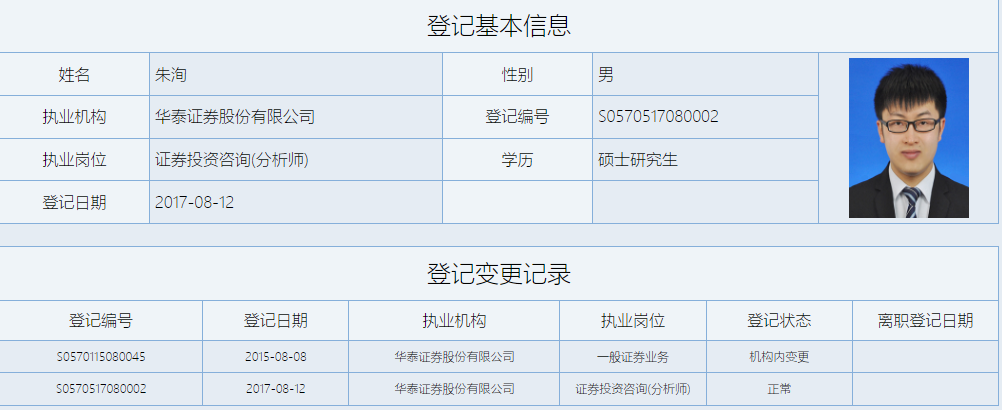 另一位署名人员朱洵先生,也有多年分析师执业经历。中证协从业人员信息显示,他于2015年8月登记执业于华泰证券,2017年8月获得分析师资质。
