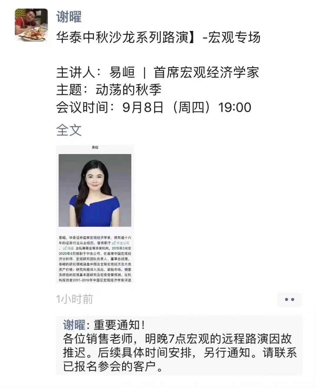 在这篇研报中署名的两位分析师之一,易峘女士(华泰证券首席宏观经济学家),原定于9月8日举行的远程路演,在发布之后紧急撤回。