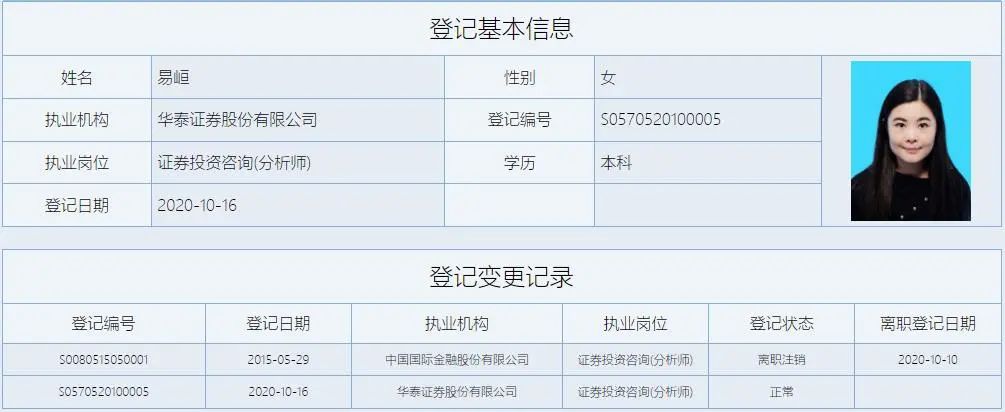 行家查看了中证协从业人员信息,易峘女士早在2015年5月便以证券分析师身份在中金公司执业。2020年10月,登记为华泰证券分析师。