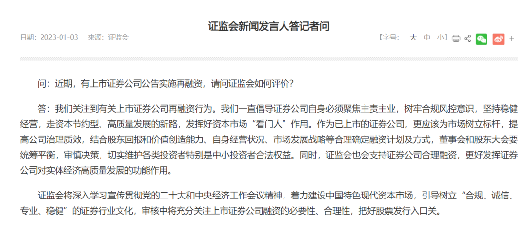 证监会通过答记者问的方式,强调“作为已上市的证券公司,更应该为市场树立标杆,提高公司治理质效,结合股东回报和价值创造能力、自身经营状况、市场发展战略等合理确定融资计划及方式,董事会和股东大会要统筹平衡,审慎决策,切实维护各类投资者特别是中小投资者合法权益。”