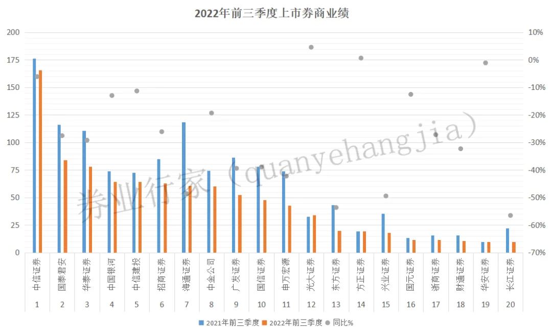 行家比较了2022年头部券商业绩表现。2022年前三季度“三中一华”净利润全数下降:中信证券净利润165.68亿元,同比下降6.11%;华泰证券净利润78.21亿元,同比降幅为29.21%;中信建投净利润64.37亿元,同比下降11.32%;中金公司净利润60.12亿元,同比下降19.34%。