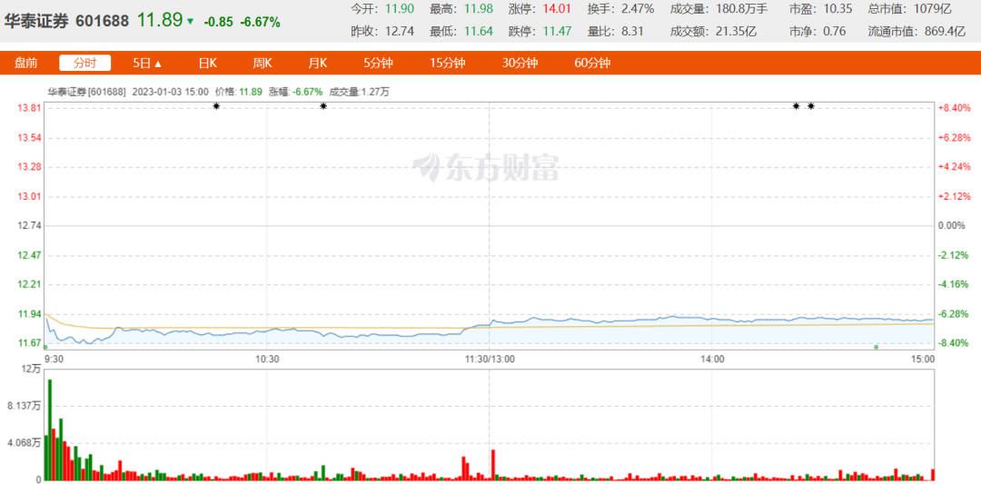 2023年第一个交易日,证券市场收获了意外惊喜。然而,曾被誉为“牛市旗手”的券商股中,华泰证券(601688.SH)却出现了大幅下跌——