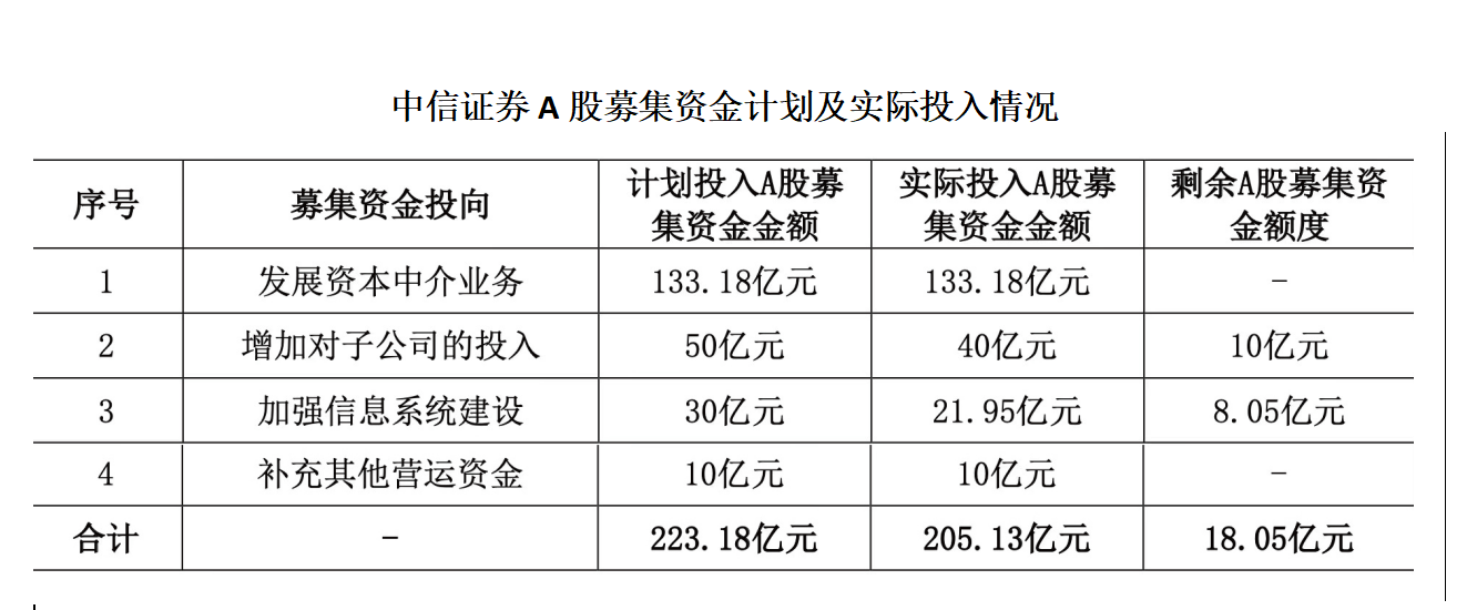 《公告》还详细披露了资金用途。超过一半募资投入发展资本中介业务,计划投入的133.18亿元目前已全部投入运营;增加对子公司的投入计划50亿元,目前已投入40亿元;加强信息系统建设计划投入30亿元,实际已投入21.95亿元;补充其他营运资金10亿元,目前已全数投入。也就是说,该笔资金实际投入A股募集资金金额合计达205.13亿元。