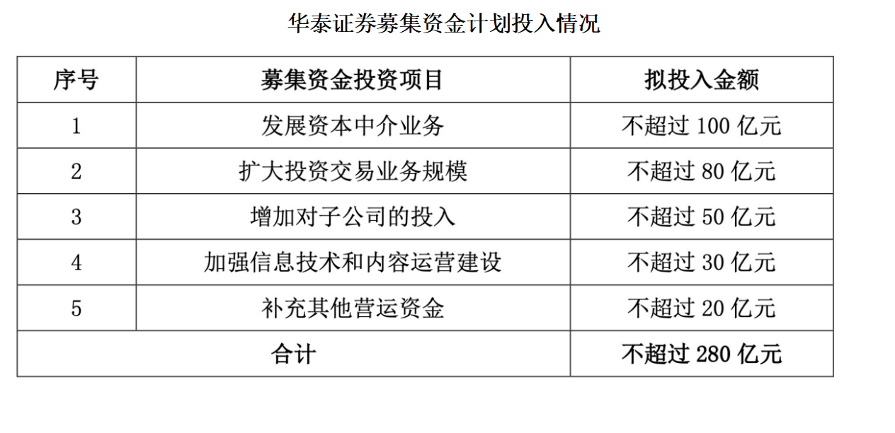 2022年的最后一天,华泰证券发布《配股公开发行证券预案》,披露募资投向规划。与中信证券类似,华泰证券也拟将大部分资金投入发展资本中介业务,拟投入不超过100亿元,在加强信息技术及内容运营建设上拟投入30亿元。