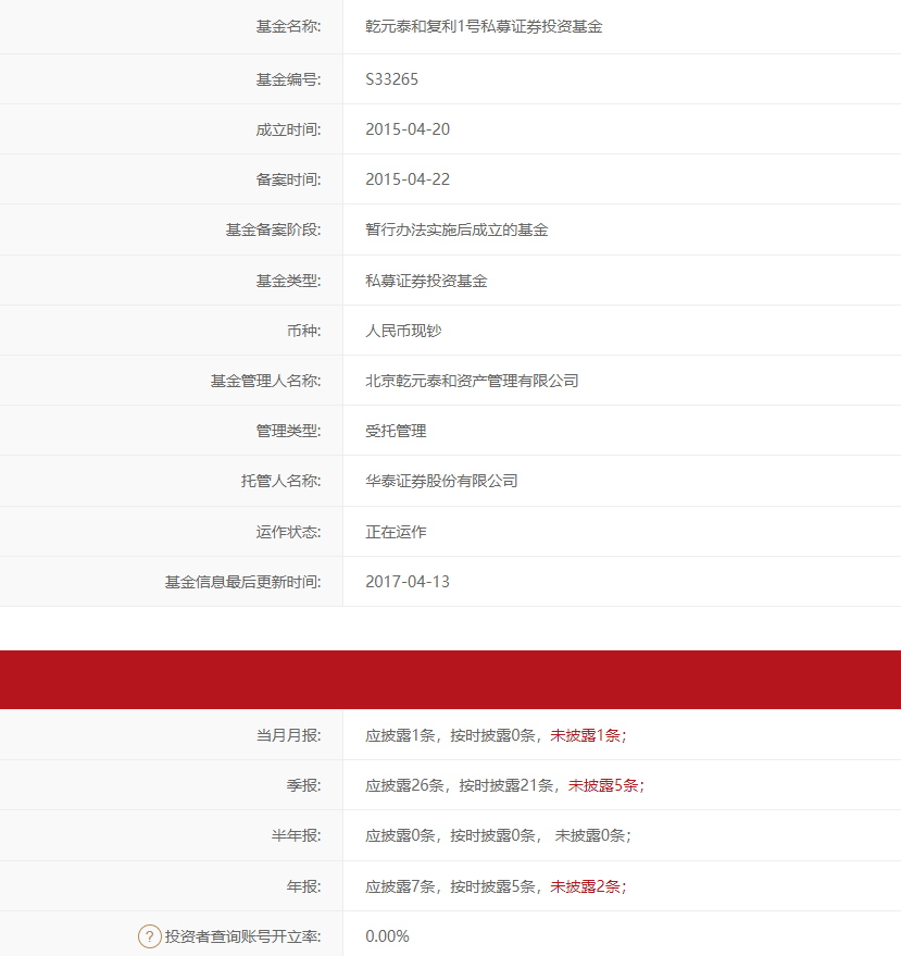 中基协信息显示,复利1号成立于2015年4月,当月完成备案。其月报、季报和年报均有多条未披露信息,且投资者查询账号开立率为0%。目前这只产品仍未清盘,在2021年第3季度的规模低于500万元。