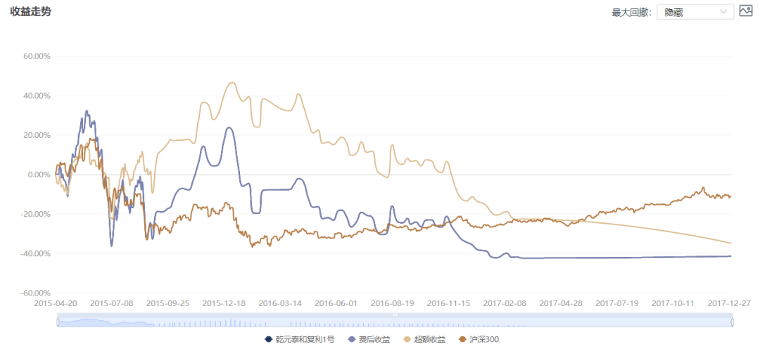 业绩方面,复利1号在2015年二季度曾经有超过35%的收益;随即大幅跳水,当年7月亏损接近四成。2015年下半年,业绩一度反弹,收益率突破20%。2016年初再度下跌,一季度末短暂回升,但未触及回本线;2016年二季度起震荡走低,当年年底亏损超过40%。在其后的一年中,大体保持这一亏损率;2017年底以后,没有再更新数据。