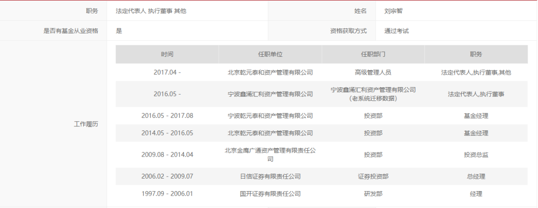 公开信息显示,乾元泰和的股东为两名自然人;其法定代表人、执行董事刘宗智持股90%。而这位是一位资深人士,早在上个世纪便任职于国开证券研发部门;2006年2月起任日信证券(现为国融证券)证券投资部总经理。2009年8月起在北京金鹰广通资产管理有限责任公司(简称:金鹰广通,已工商注销)任投资总监。2014年,他创立乾元泰和。