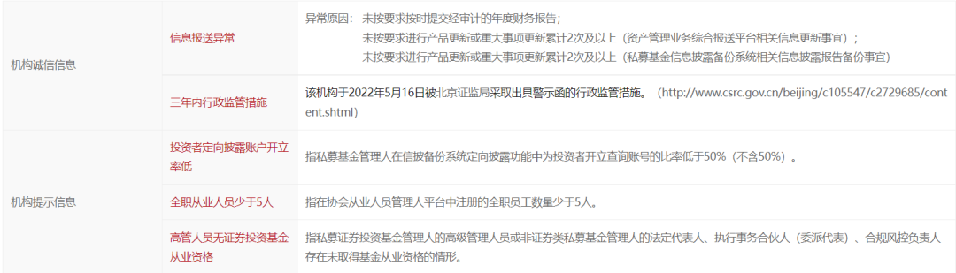 目前,乾元泰和有两条诚信信息,分别是信息报送异常和三年内行政监管措施。另有三条提示信息:投资者定向披露账户开立率低;全职从业人员少于5人;高管人员无证券投资基金从业资格。