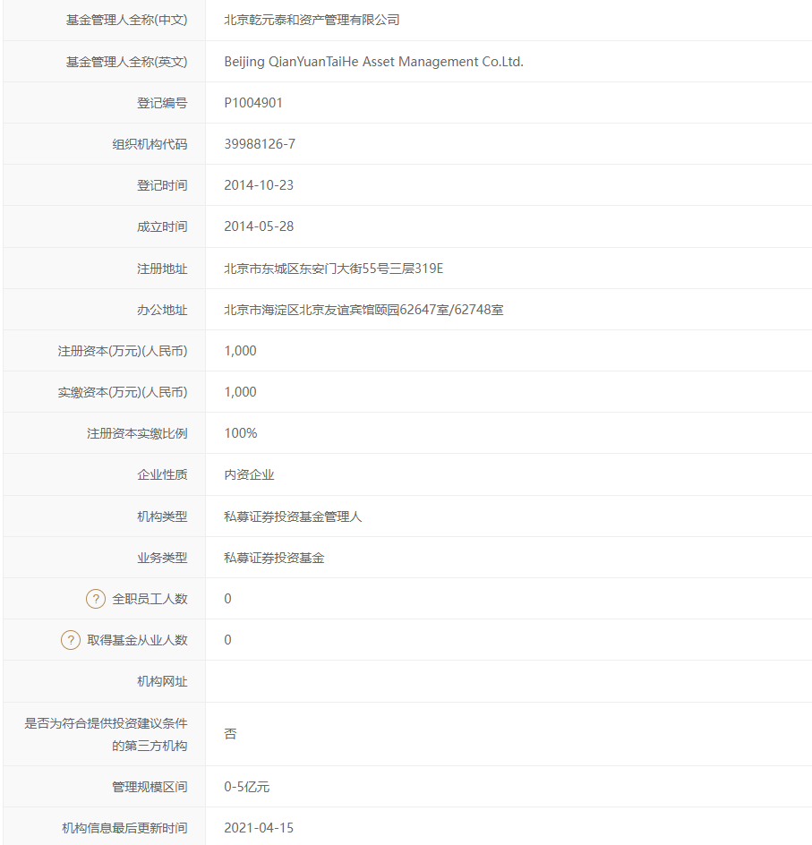 据中基协备案信息,乾元泰和是一家颇为老牌的私募机构:成立于2014年5月,同年10月完成备案。目前存续的产品4只,并且没有全职员工。