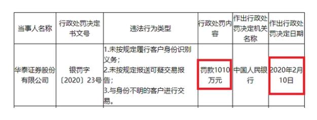 2020年2月,华泰证券曾收到中国人民银行的《行政处罚决定书》,因为反洗钱业务违法被罚款1010万元。