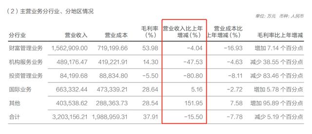 其中,财富管理业务收入156.29亿元,同比小幅下降4.04%。机构服务业务收入48.92亿元,同比减少47.53%。最夸张的是投资管理业务,收入同比——