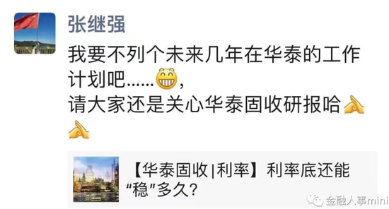 张继强还在朋友圈回应说:我要不列个未来几年在华泰的工作计划吧,请大家还是关心华泰固收研报吧!