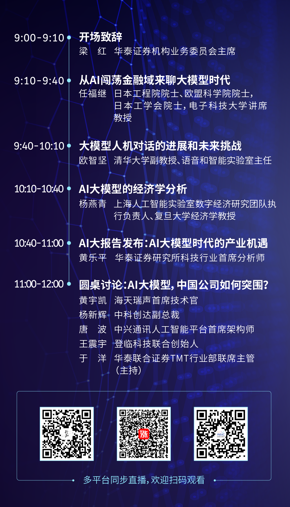 7月8日上午,华泰证券将在2023年世界人工智能大会举办“AI大模型的金融数智化机遇”科技金融创新论坛。此次是华泰证券第三年与世界人工智能大会合作,面对通用人工智能发展掀起的技术新浪潮,今年的论坛将聚焦代表性的AI大模型,前瞻技术发展前景,还将邀请产业专家、投资专家探讨技术的落地、在包括金融等产业的应用前景以及投资机遇。华泰证券研究所TMT团队也将在本次论坛上发布AI大报告,针对AI大模型企业是如何炼成的、中国如何解决AI算力瓶颈等热点议题进行分享,展望AI大模型时代的产业机遇。欢迎7月8日9:00准时收看线上直播!