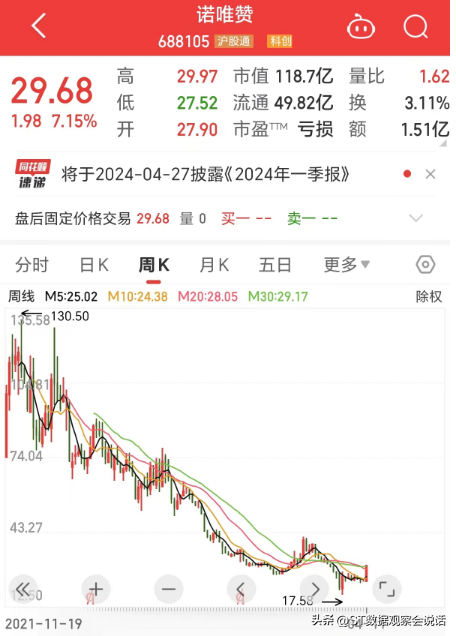 在2021年11月15日诺唯赞上市便遭到炒作,从74元炒作到130.5元以后,华泰证券再次在包销的金额上面大赚几千万;此后诺唯赞的股价便一蹶不振,持续不断的下跌,任何人来都是抄家,跌到了现在的29.68元,跌幅高达77.25%。