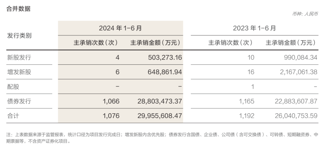 根据2024年半年度报告披露,报告期内,公司全市场前十大IPO项目参与3单、前十大再融资项目参与3单。根据统计数据,公司股权主承销金额(含首次公开发行、增发、配股、优先股、可转债、可交换债)人民币195.45亿元,行业排名第二;IPO 保荐项目数量4单,行业排名第一。