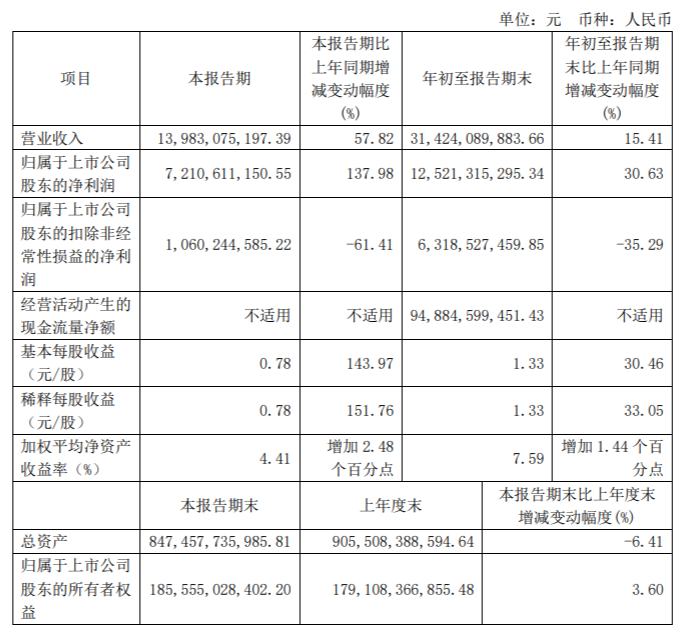 2024年三季度,华泰证券营业收入为139.83亿元,同比增长57.82%;归属于上市公司股东的净利润为72.11亿元,同比增长137.98%;而归属于上市公司股东的扣除非经常性损益的净利润则为10.6亿元,同比下降61.41%。