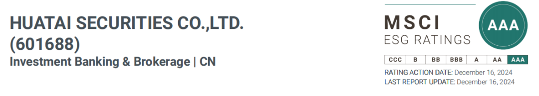 近日,国际权威指数机构明晟公司(MSCI)公布华泰证券股份有限公司2024年ESG评级结果。凭借优异的ESG治理实践,华泰证券MSCI ESG评级从AA级跃升至AAA级,实现两年连续进阶,达到全球投资银行业的最高评级。