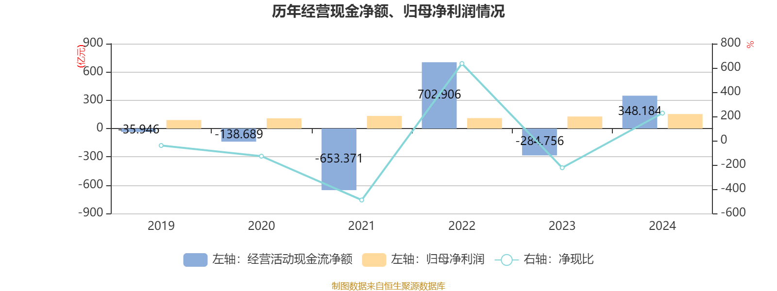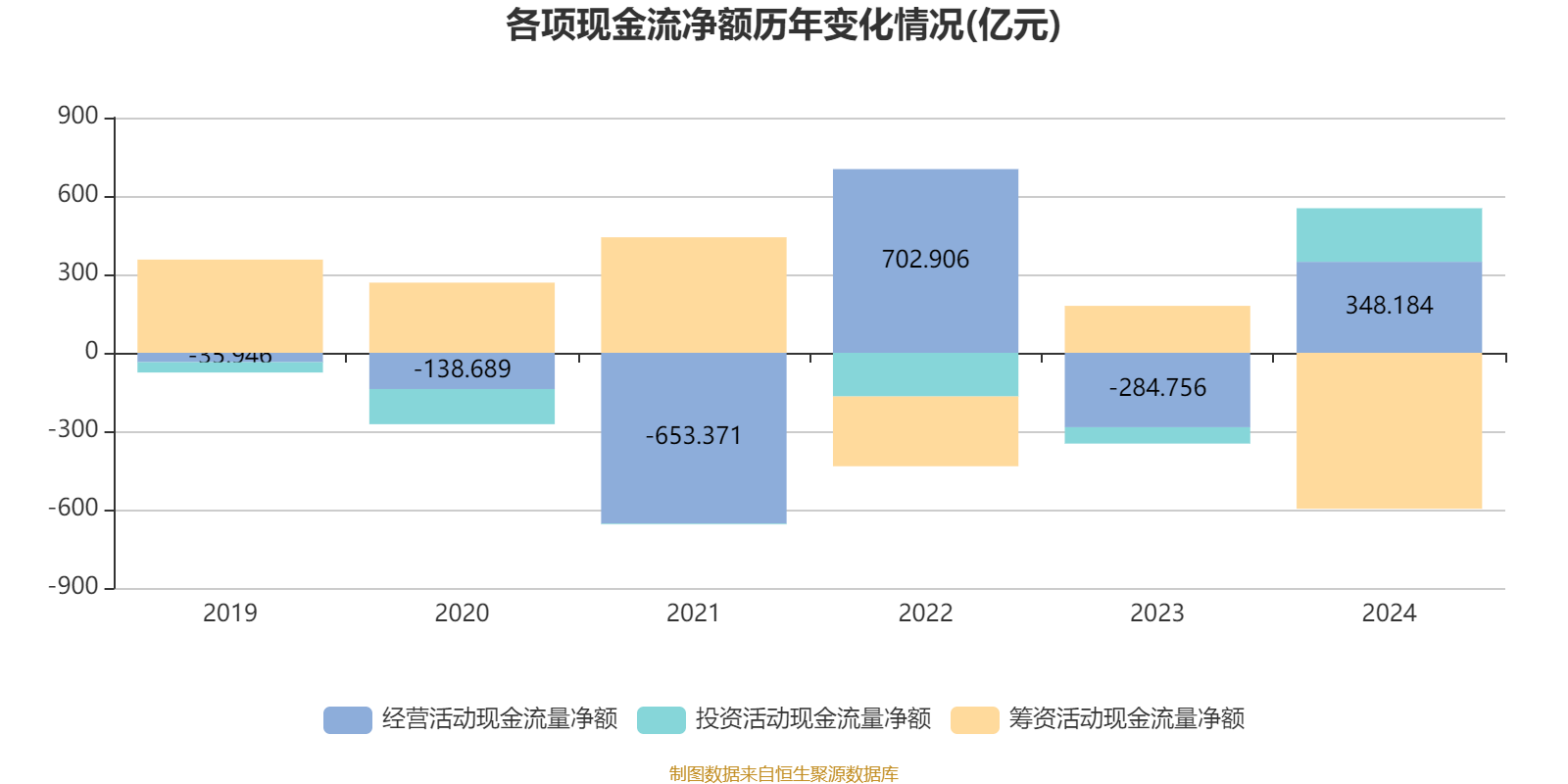2024年,公司经营活动现金流净额为348.18亿元,同比增加632.94亿元;筹资活动现金流净额-596.7亿元,同比减少776.32亿元;投资活动现金流净额204.96亿元,上年同期为-62.64亿元。