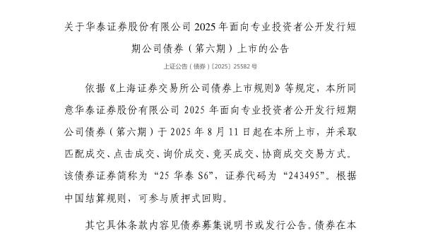 依据《上海证券交易所公司债券上市规则》等规定,上交所同意华泰证券股份有限公司2025年面向专业投资者公开发行短期公司债券(第六期)于2025年8月11日起在上交所上市,并采取匹配成交、点击成交、询价成交、竞买成交、协商成交交易方式。该债券证券简称为“25华泰S6”,证券代码为“243495”。根据中国结算规则,可参与质押式回购。