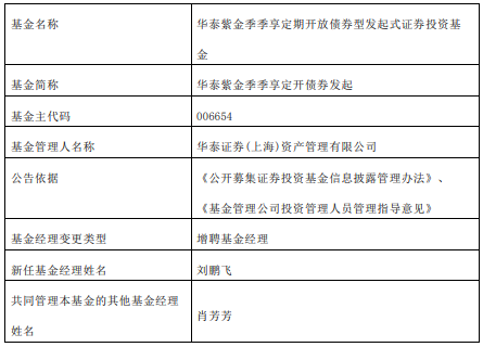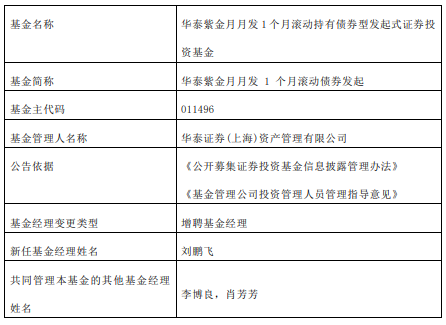 今日, 华泰证券 (上海)资产管理有限公司公告,华泰紫金月月发1个月滚动债券发起、华泰紫金季季享定开债券发起增聘刘鹏飞。