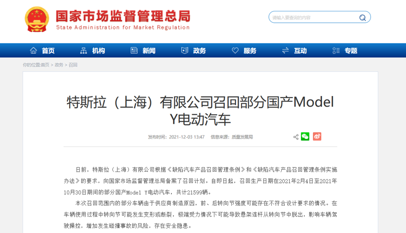 特斯拉召回公告;图片来源:国家市场监督管理总局官网