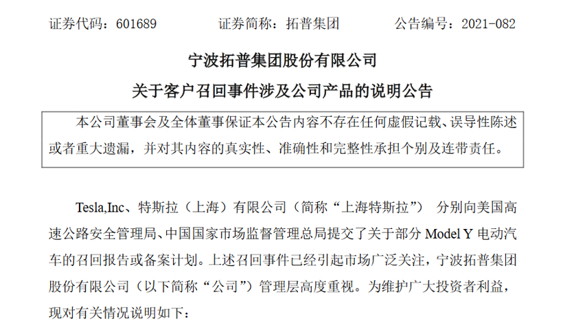 针对特斯拉的两起召回事件,拓普集团于12月5日发布公告,对此事件涉及的公司产品进行了说明: