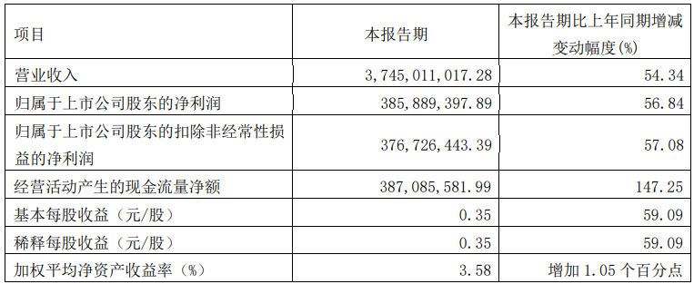 报告期内,营业收入3,745,011,017.28元,较上年同比增长54.34%,主要系本期公司拓展的国内外优质客户放量所致;财务费用较上年78.63%,主要系本期贷款利息增加所致其他收益;较上年同期增长200.35%,主要系本期政府补助增加所致。