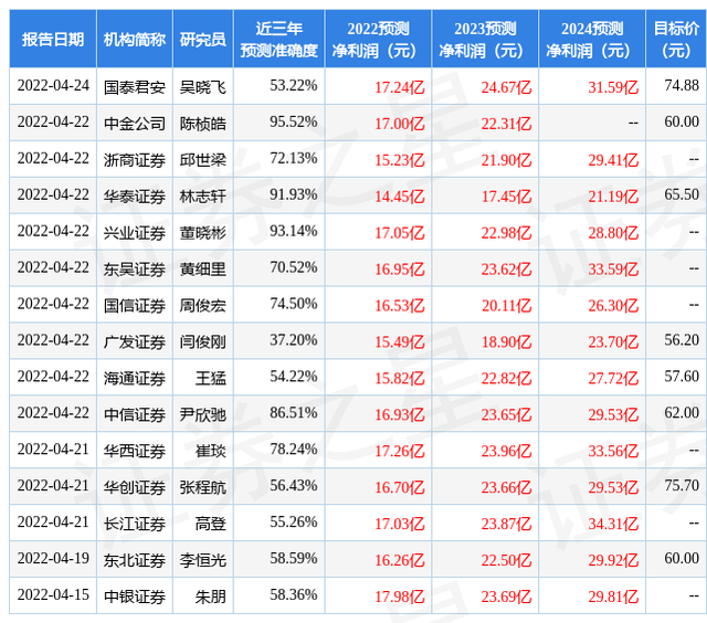 证券之星数据中心根据近三年发布的研报数据计算,中金公司陈桢皓研究员团队对该股研究较为深入,近三年预测准确度均值高达95.52%,其预测2022年度归属净利润为盈利17亿,根据现价换算的预测PE为37.44。