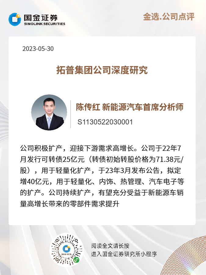 公司积极扩产,迎接下游需求高增长。公司于22年7月发行可转债25亿元(转债初始转股价格为71.38元/股),用于轻量化扩产,于23年3月发布公告,拟定增40亿元,用于轻量化、内饰、热管理、汽车电子等的扩产。公司持续扩产,有望充分受益于新能源车销量高增长带来的零部件需求提升。