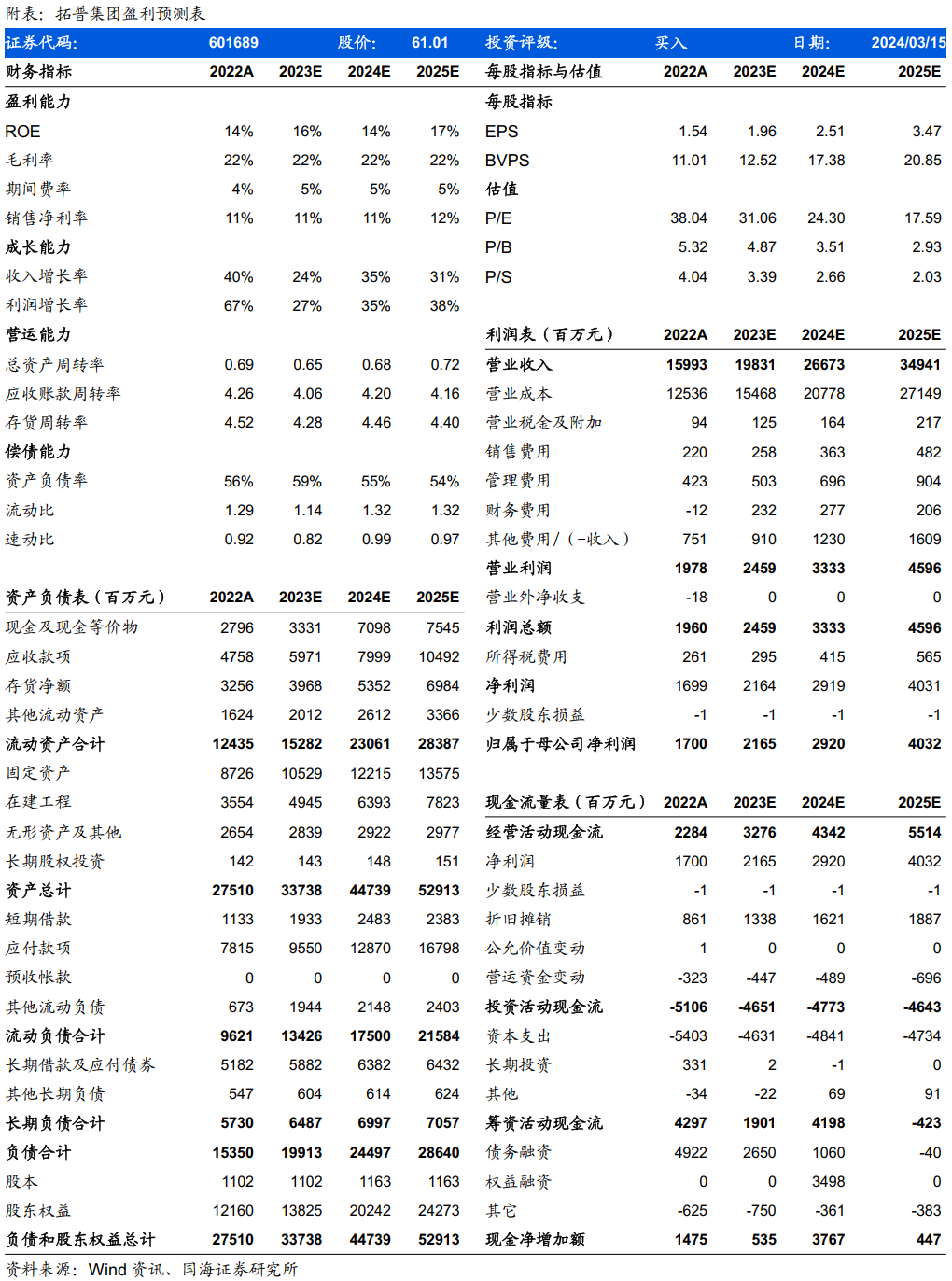 盈利预测和投资评级公司为国内平台型汽车零部件企业龙头,在客户、品类的持续开拓下业绩有望保持稳定增长,结合最新情况,我们调整公司的盈利预测,预计公司2024-2025年实现营业务收入267、349亿元,同比增速为35%、31%;实现归母净利润29.2、40.3亿元,同比增速35%、38%;EPS为2.5、3.5元,对应PE估值分别为24、18倍,我们看好公司未来发展,维持“买入”评级。