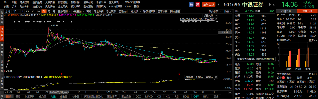 “高光时刻”后,中银证券股价维持震荡下跌态势。从2021年走势来看,中银证券股价今年6月底回暖至年内最高价21.81元/股,10月底则跌至年内新低12.53元/股。以12月17日14.08元/股收盘价计算,中银证券最新市盈率(TTM)为39.98倍,总市值为391亿元。