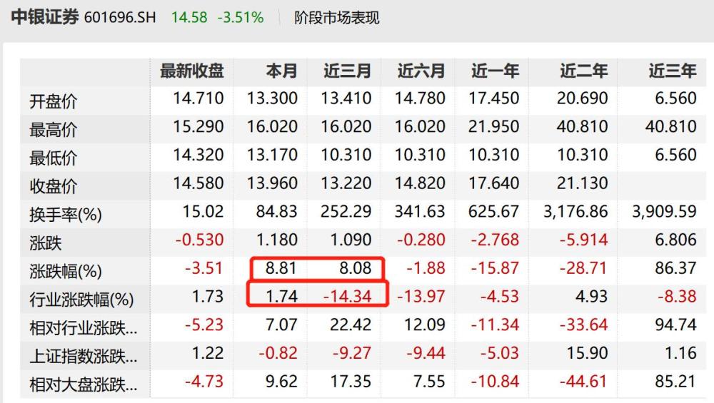 需要关注的是,在公告发布当天,中银证券已连续两日收获涨停。实际上,中银证券近期多次领涨券商板块,可以称之为“人气龙头股”,在近一年内,中银证券已8次封住涨停板。Wind显示,中银证券近三月累计涨幅为8.08%,而与之相对比的则是,整个券商板块累计下跌14.04%。
