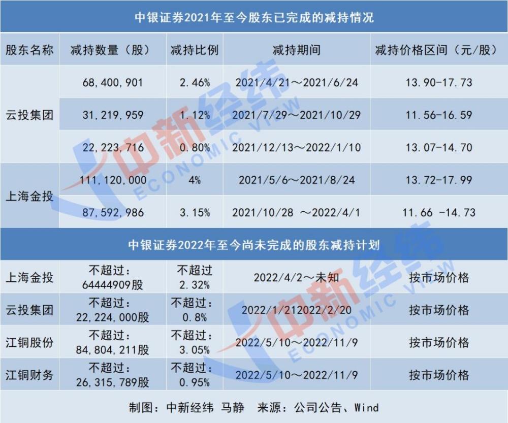 进入2022年以来,中银证券又发布6次股份增减持公告。根据公告,上海金投在2021年10月15日披露的拟减持公司股份不超过152,037,895股,不超过公司总股本的5.47%的计划,目前已减持约8759.30万股,占公司总股本的3.15%,尚未减持完毕。云投集团则在1月11日披露已减持约2222.37万股的结果后,又于1月18日和3月16日推出新的减持计划,合计拟减持6389.40万股,不超过公司总股本的2.3%。
