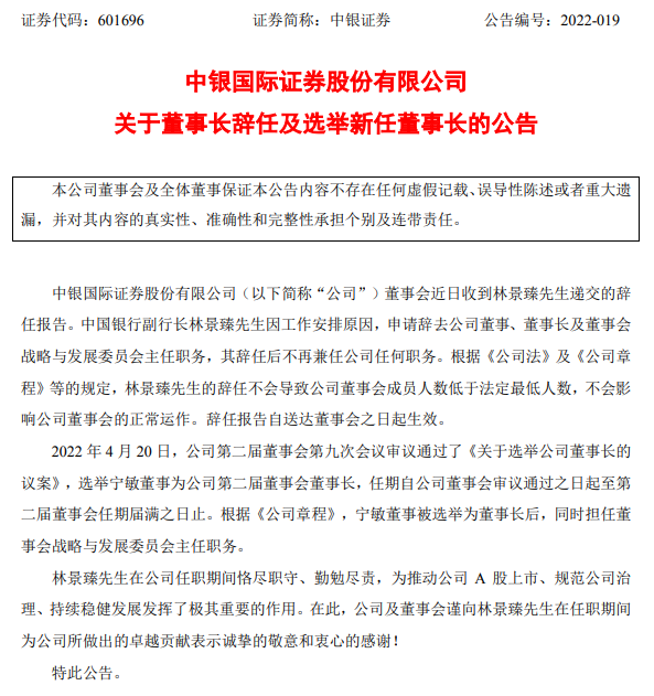 4月21日,A股上市的中银证券发布公告称,公司董事会收到林景臻递交的辞任报告,其申请辞去公司董事、董事长等职务。