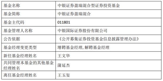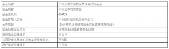 其中,中银证券汇享定期开放债券由原共同管理该基金的王文华独立管理;中银证券盈瑞混合增聘基金经理王文华,与蒲延杰共同管理;中银证券安泰债券增聘基金经理王文华,与刘先政共同管理;中银证券汇福定期开放债券增聘基金经理王玉玺,与余亮共同管理。