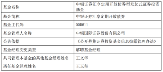今日,中银国际证券股份有限公司发布基金经理变更公告,王玉玺因工作调整离任中银证券汇享定期开放债券(005611)、中银证券盈瑞混合(A类011801;C类011802)、中银证券安泰债券(A类009728;C类009729),同时,中银证券汇福定期开放债券(010946)增聘基金经理王玉玺。