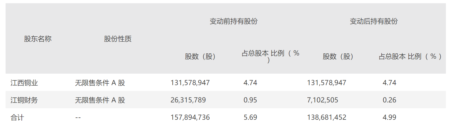 中银证券表示,此次权益变动为公司股东江西铜业及其一致行动人江铜财务履行此前披露的股份减持计划,合计持股比例从5.69%减少至4.99%,不触及要约收购。