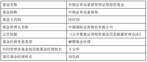 今日,中银国际证券股份有限公司发布公告,刘先政离任中银证券安泰债券,王文华继续管理。