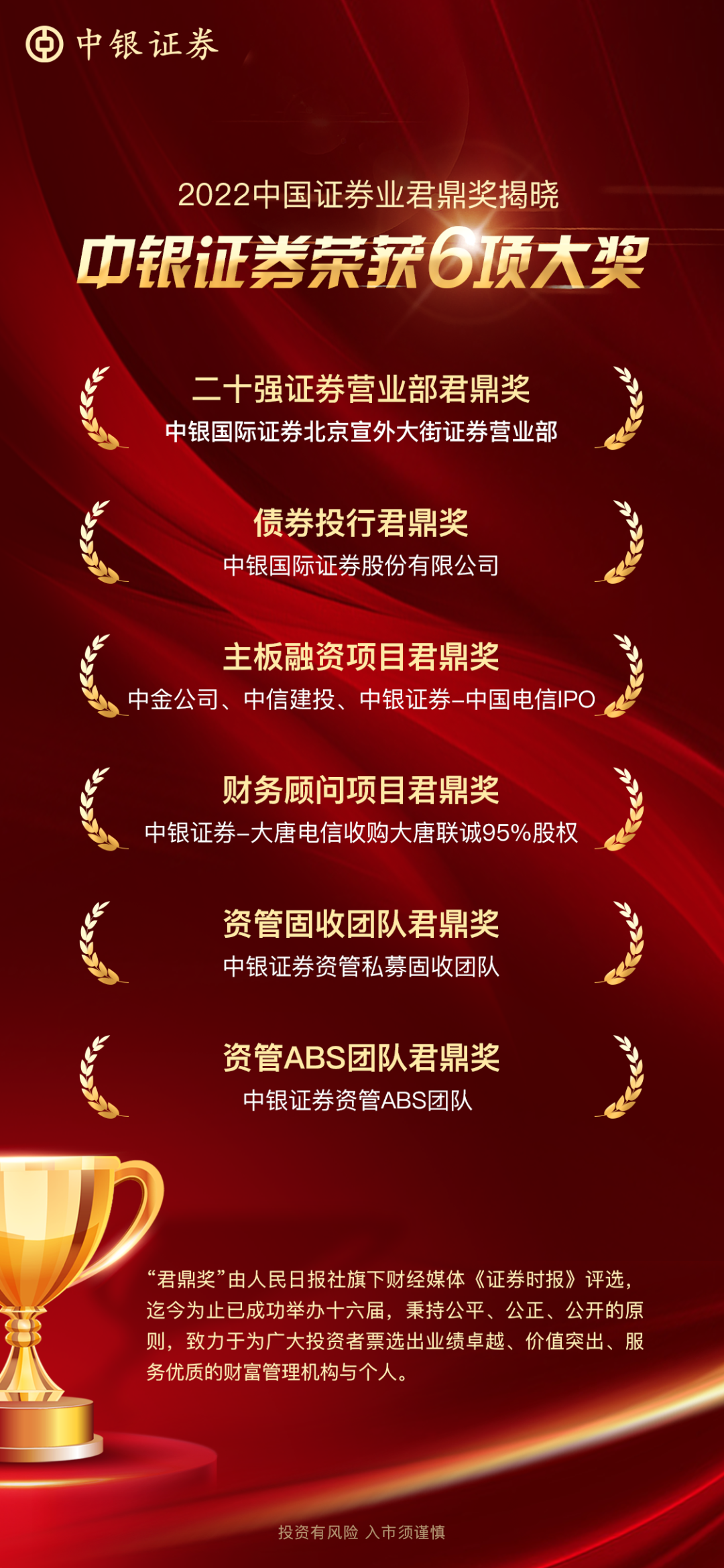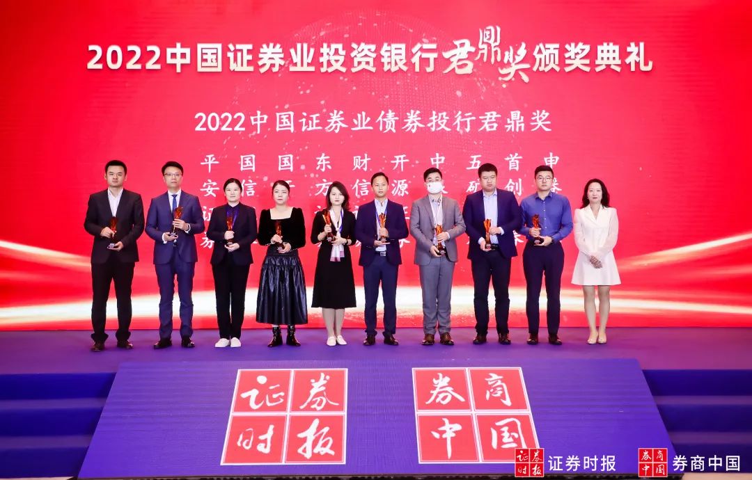 12月1日,由行业权威媒体《证券时报》主办的2022年度君鼎奖评选正式揭晓。我司荣获“2022中国证券业债券投行君鼎奖”,北京宣外大街证券营业部荣获“二十强证券营业部君鼎奖”,资管私募固收团队荣获“2022中国证券业资管固收团队君鼎奖”,资管ABS团队荣获“2022中国证券业资管ABS团队君鼎奖”,投行参与的中国电信IPO项目荣获“2022中国证券业主板融资项目君鼎奖”,投行参与的大唐电信收购大唐联诚95%股权项目荣获“2022中国证券业财务顾问项目君鼎奖”,共计斩获六项大奖。