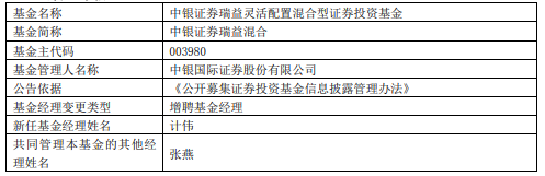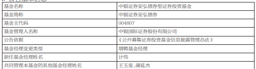 12月21日讯今日,中银国际证券股份有限公司发布公告,中银证券瑞益混合、中银证券安弘债券增聘基金经理计伟。