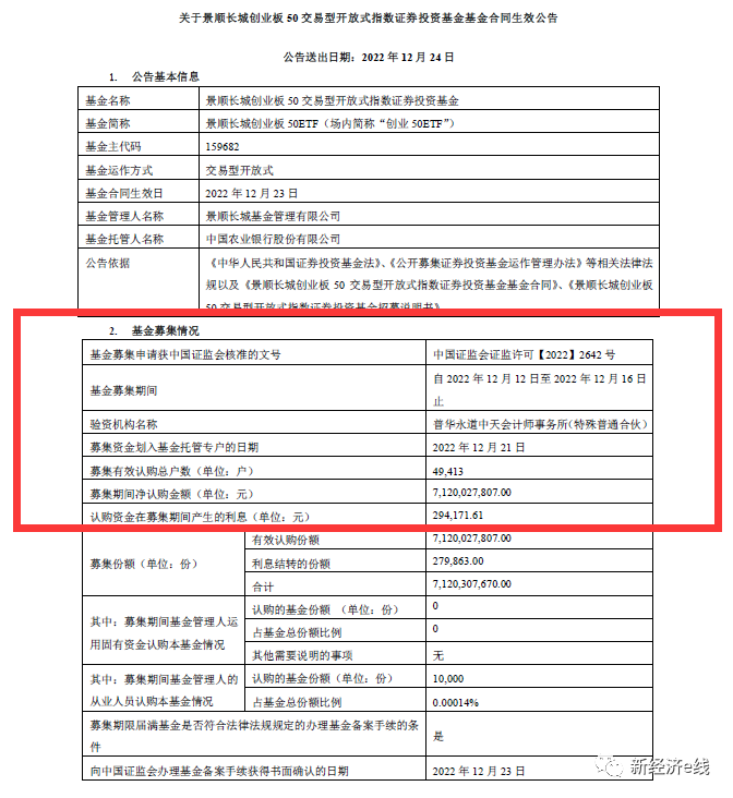 作为被动指数型基金,景顺长城创业板50ETF(159682)募集规模也超过70亿元,市场反响热烈。12月24日,景顺长城创业板50ETF披露的公告表明,基金合同于12月23日生效,募集规模合计达71.2亿元,募集有效认购总户数为49413户。此前,该基金自2022年12月12日至2022年12月16日进行发售。