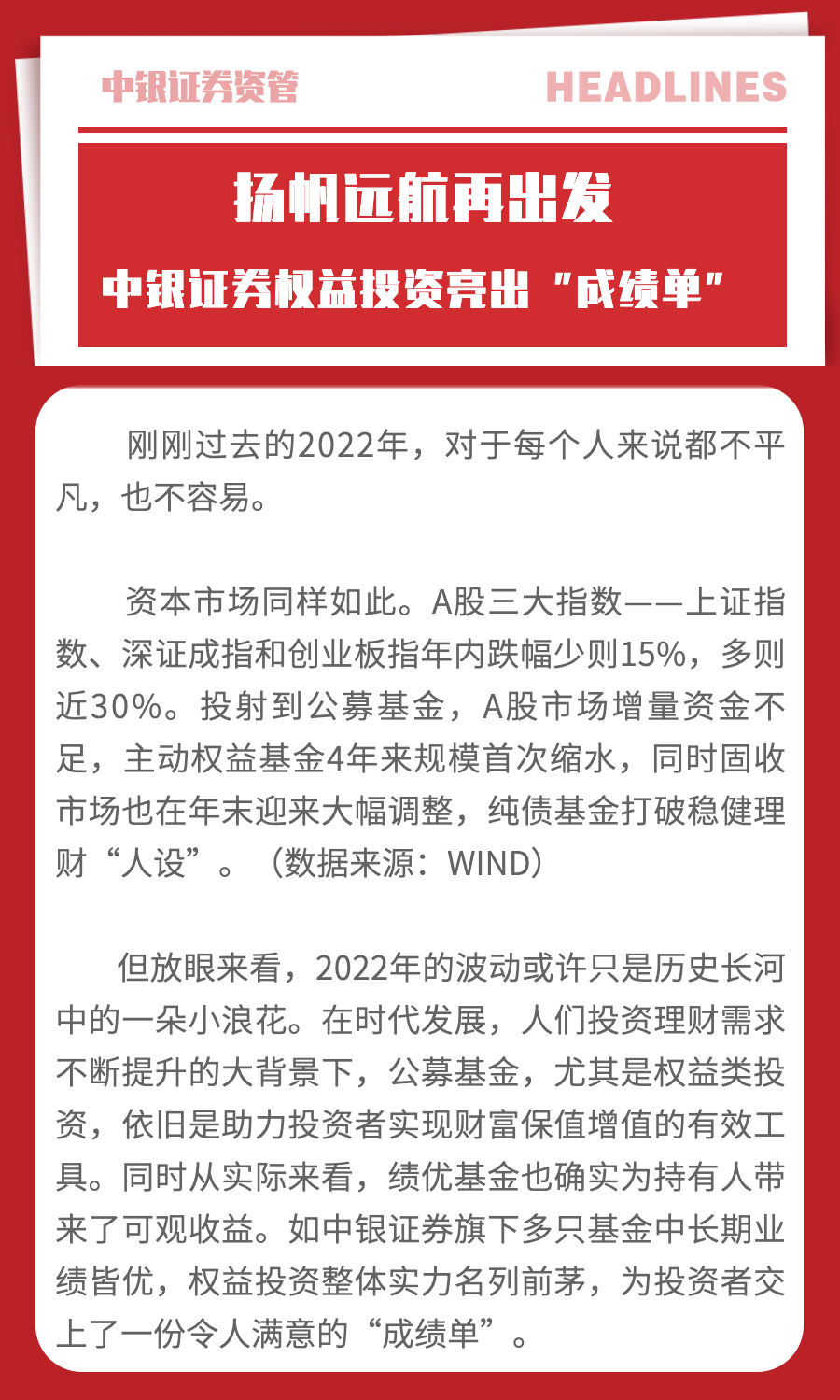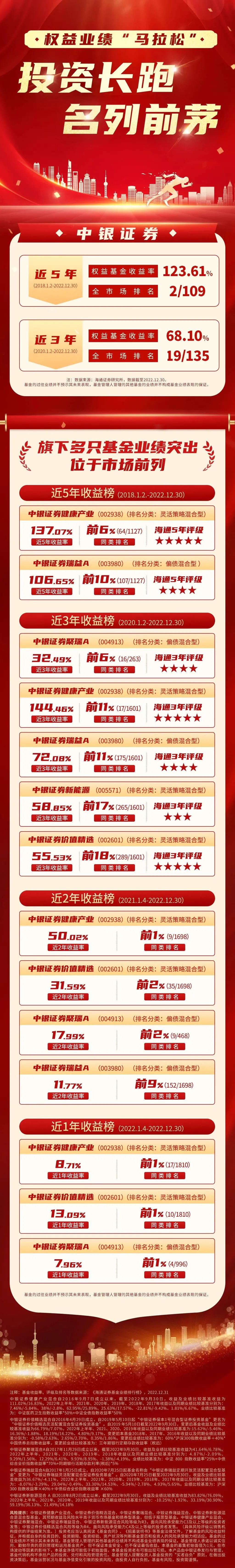 送别2022年,资管行业也迎来一年一度的年终盘点。近年来权益投资逐渐崛起的中银证券为投资者交上了一份令人满意的“成绩单”——最近5年权益类公募基金产品投资业绩全市场排名第2,同时旗下多只基金收获五星评级。