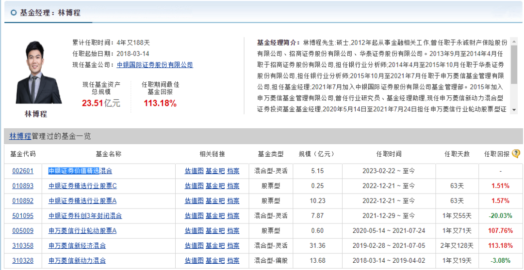 中银证券价值精选交由林博程管理,他表面上业绩虽然不错,但是缺乏一只长期单独管理的产品做背书,所以我们也很难来真正了解他的投资实力。