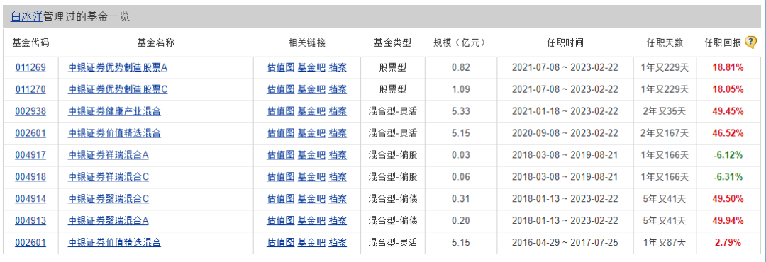 2月22日,中银国际证券公告,基金经理白冰洋因个人原因离职,离任包括中银证券优势制造、中银证券健康产业、中银证券价值精选、中银证券聚瑞在内4只基金的基金经理职务。