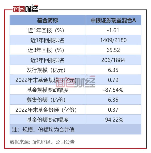 中银证券瑞益混合的发行规模约6.35亿元(对应份额约6.35亿份)。2022年四季度末,该基金的基金资产净值约为0.79亿元、基金份额总额约为0.37亿份,分别下降约87.54%、94.22%。