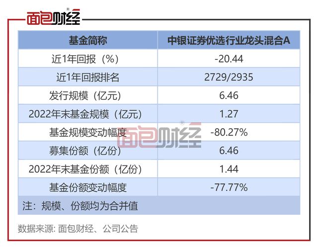 中银证券优选行业龙头混合的发行规模约6.46亿元(对应份额约6.46亿份)。2022年四季度末,该基金的基金资产净值约为1.27亿元、基金份额总额约为1.44亿份,分别下降约80.27%、77.77%。