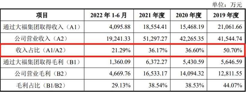 此外,鸿安机械的第一大客户均为大福集团,鸿安机械期内向其销售收入分别为2.11亿元、1.55亿元、1.86亿元和4095.88万元,分别占当期总收入比重的50.70%、36.6%、36.17%和21.29%。