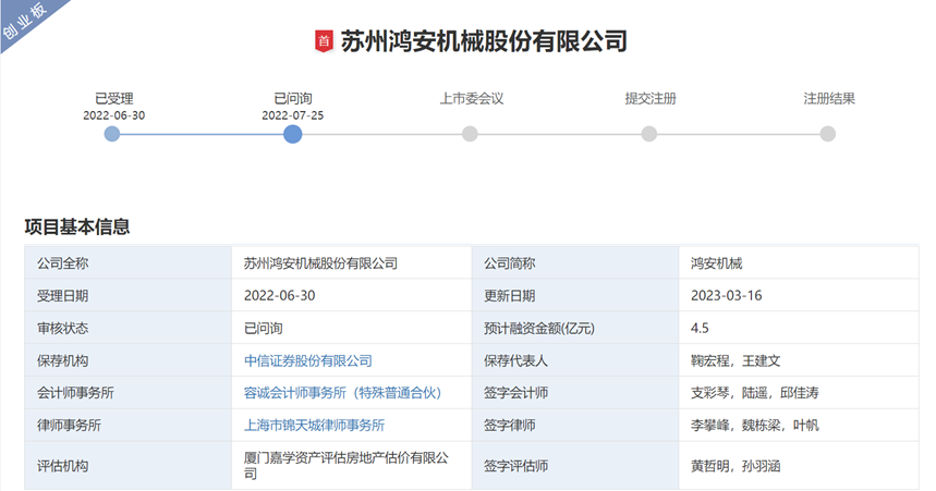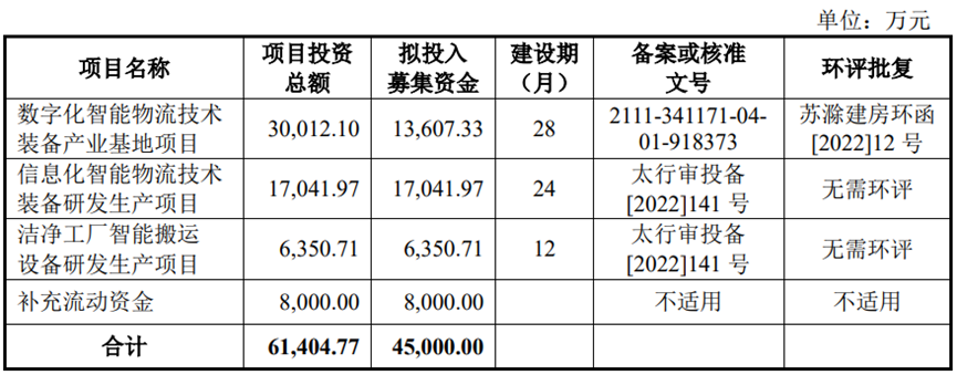鸿安机械拟公开发行数量不超过33,617,265股,占发行后总股本比例不低于25%。预计募集资金4.5亿元,用于数字化智能物流技术装备产业基地项目、信息化智能物流技术装备研发生产项目、洁净工厂智能搬运设备研发生产项目以及补充流动资金。