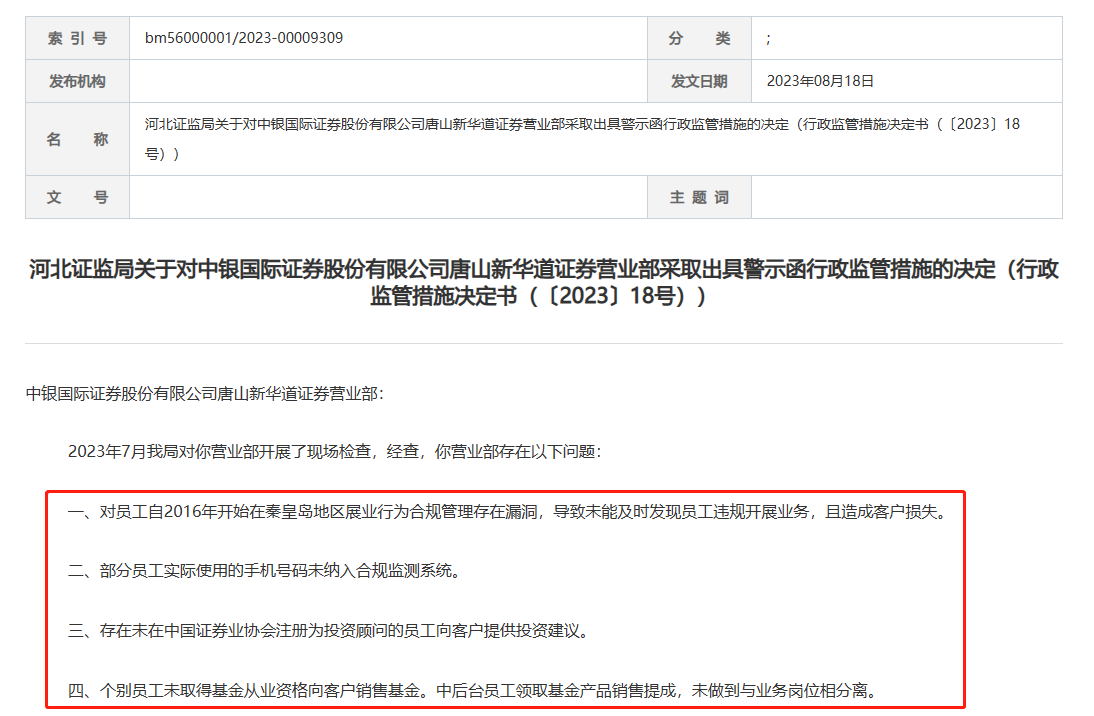 8月18日,中国证监会河北监管局网站公布了多份警示函行政监管措施,涉及对象包括中银证券(601696.SH)唐山新华道证券营业部以及该营业部的两名从业人员。