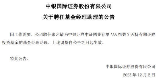 近日,中银国际证券股份有限公司公告称,因工作需要,公司聘任张艺敏为中银证券中证同业存单AAA指数7天持有期证券投资基金的基金经理助理。
